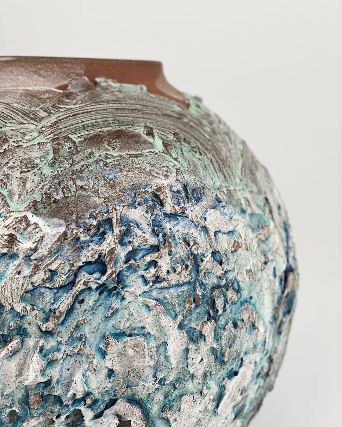 My ceramics are primarily brightly coloured vessels and moon-jars depicting nature in the form of landscapes and oceans which I feel deeply connected to. I explore colour and textures and try to create a balance in tensions between matte and glazed surfaces within the form, in parallel with our earth’s surfaces. My work is wheel thrown and sometimes altered to accommodate the landscape format, often painting brush strokes in vitreous slips, oxides and glazes in multiple layers
