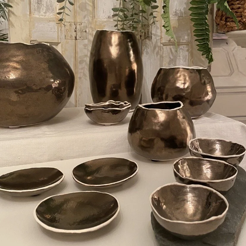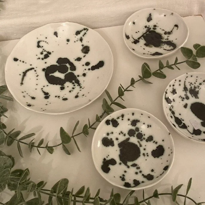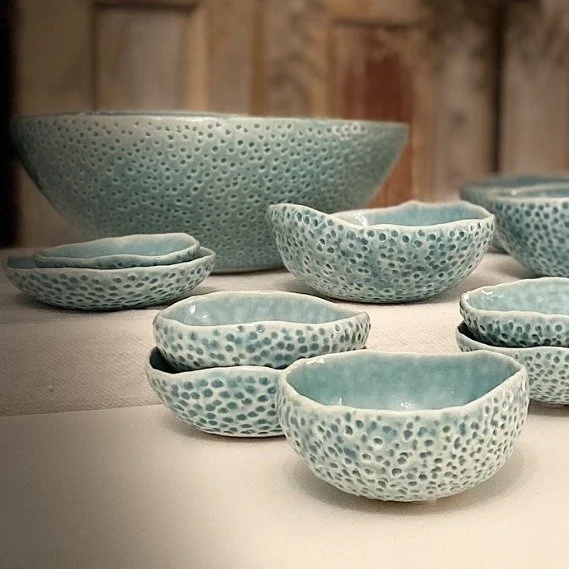 I work mainly with the extremes of fine porcelain and sandy crank clay, producing hand-built functional, decorative, and sculptural pieces. I am inspired by the shapes and colours found in my garden, North Cornwall’s rugged coast, rock pools, coral and the changing light and texture.